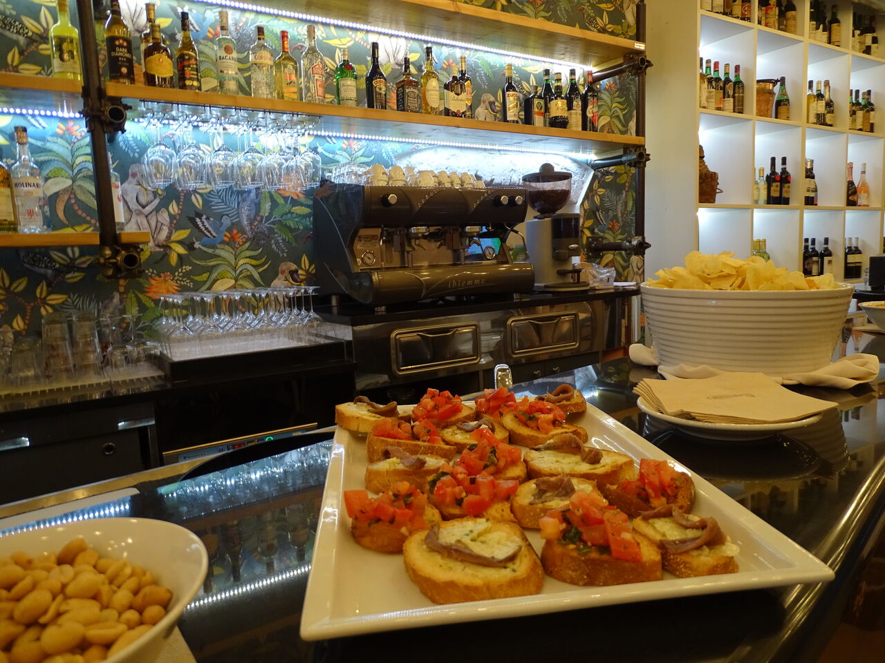 Il menu dell Wine Bar (enoteca) include bruschette, crostoni, vari tipi di insalate, insalata  greca, caprese, taglieri di salumi o formaggi, crostini ai fegatini crostini di polenta ai porcini.